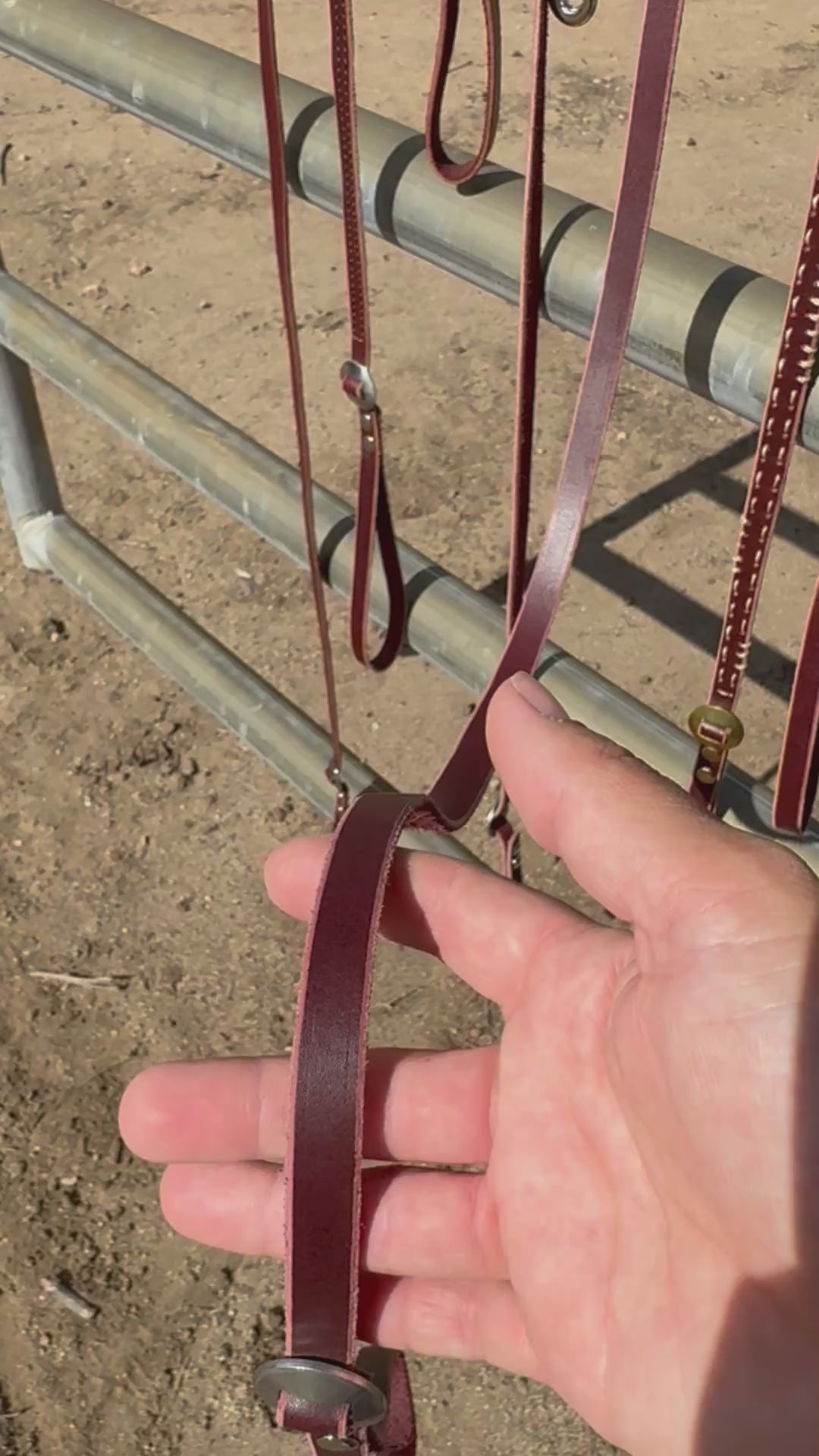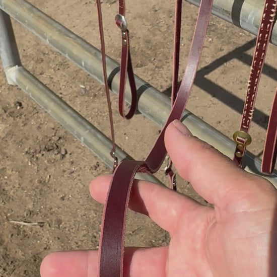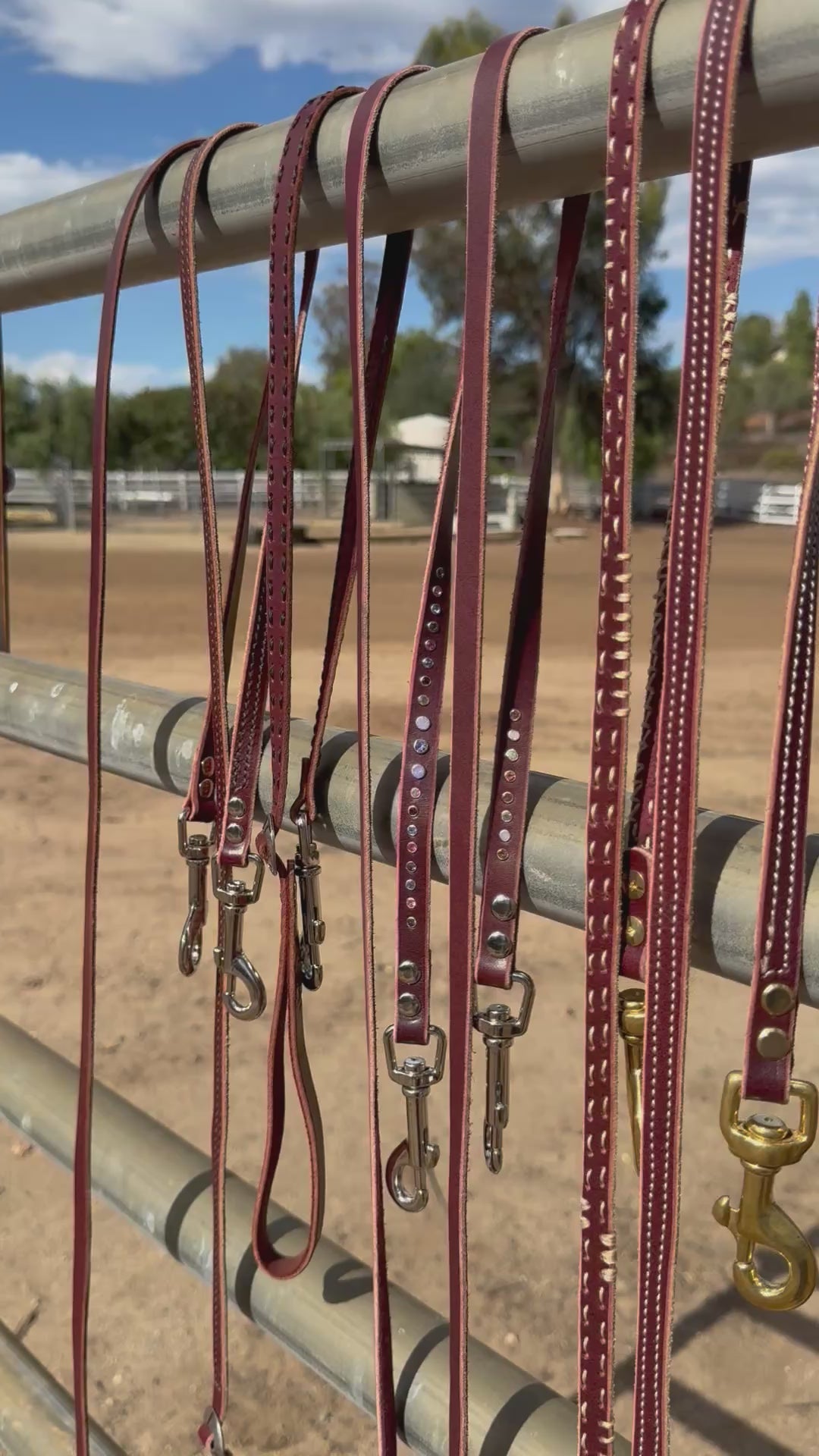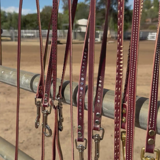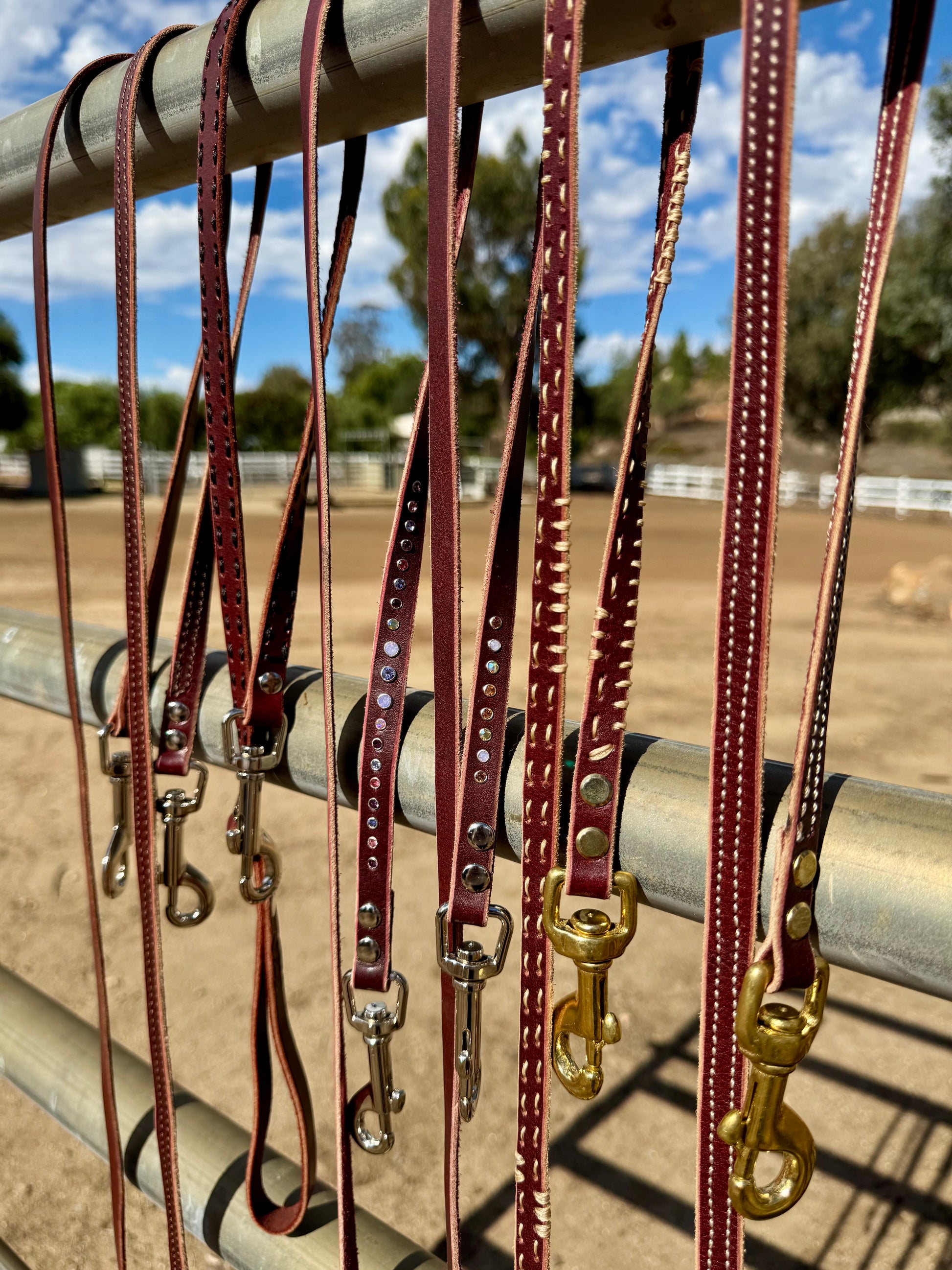 1/2” latigo strip leash with one double-slotted stainless concho near handle. The leash has 8 beautiful fall pink and tan toned rhinestones near the clip-edge and dog. Length: 55 inches