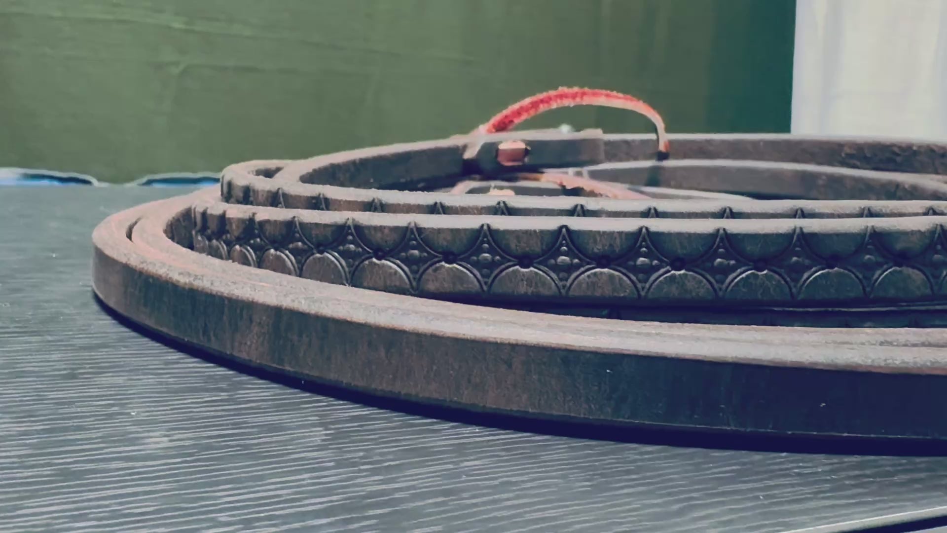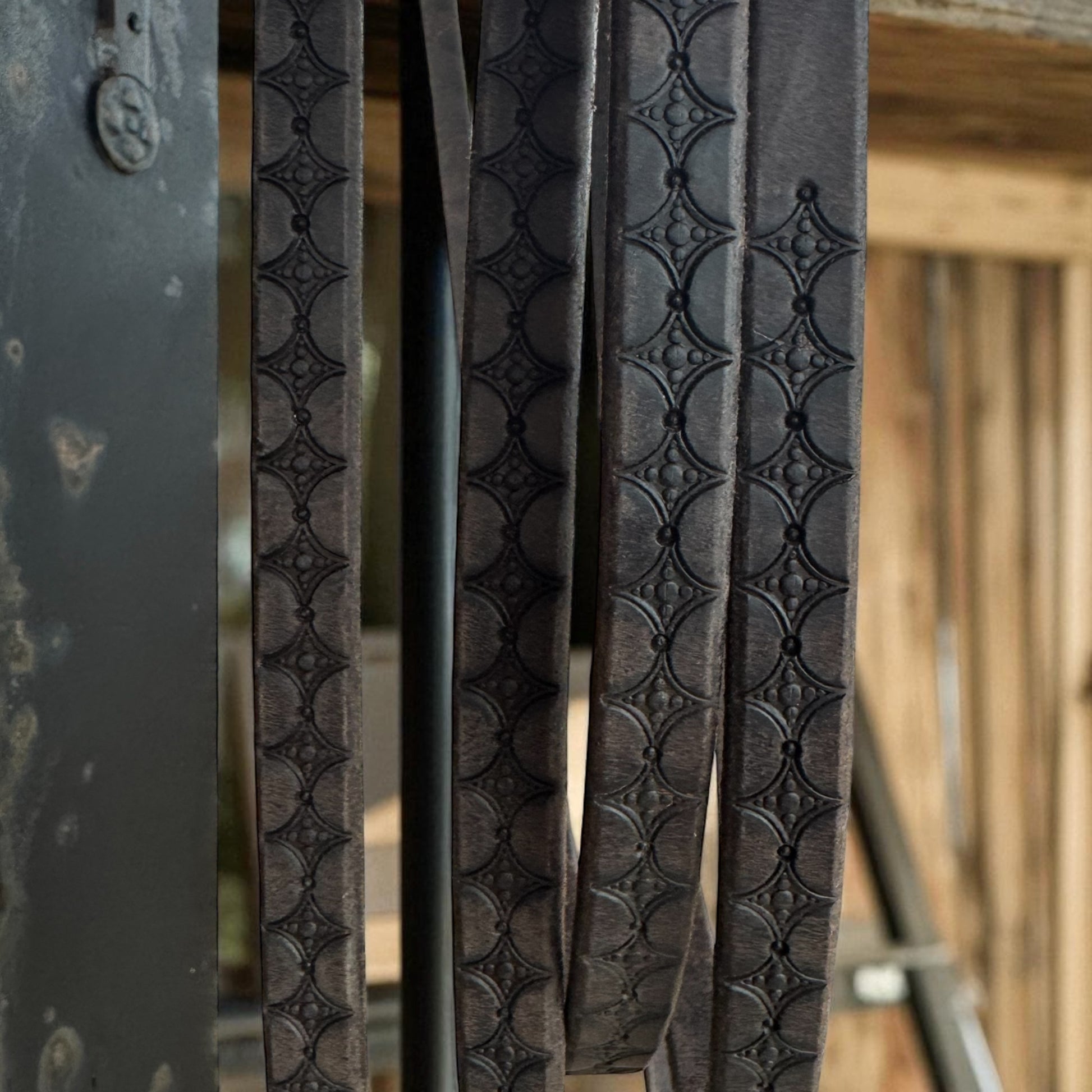 Custom tooled split reins. These are 8ft Herman Oak 5/8” wide toed reins in a chocolate stain.