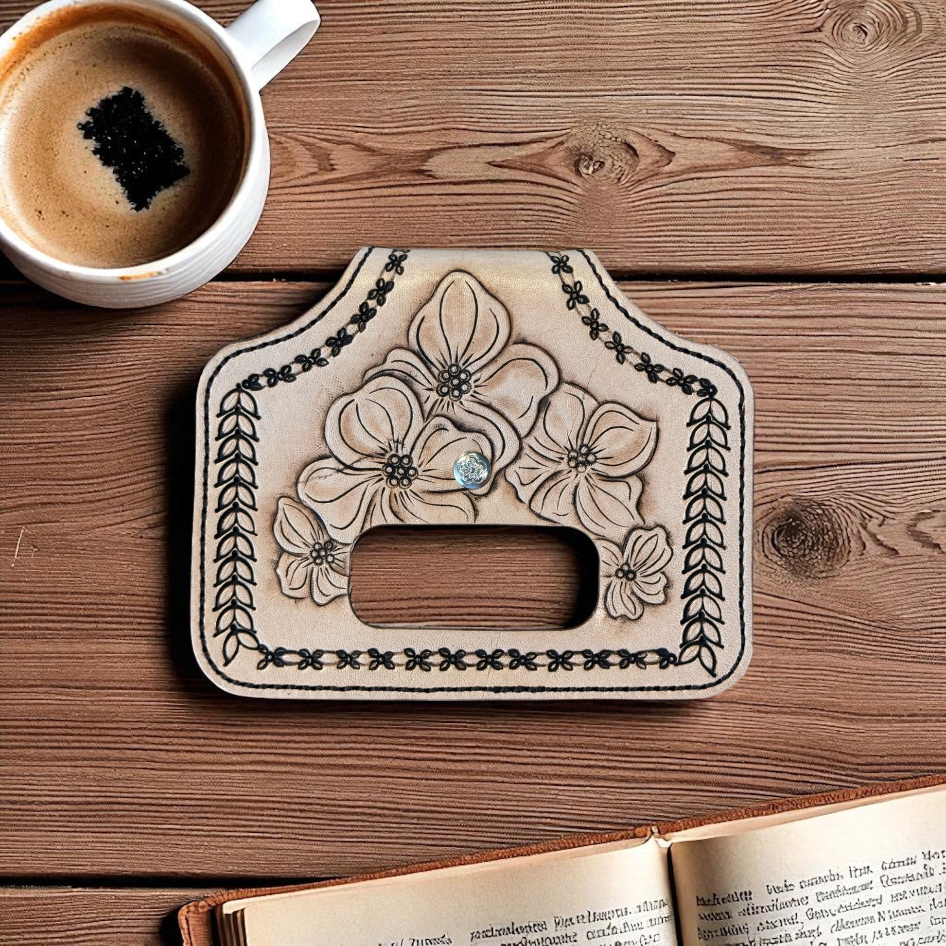 Hand tooled leather towel holder. Approximate dimensions when hung are width: 5.5 in and height: 5 in.
