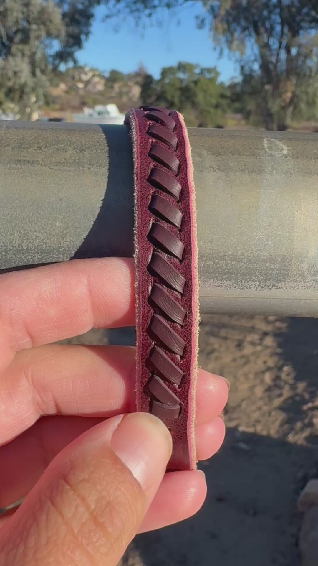 1/2” wide latigo strap with burgundy kangaroo laced through dog collar. Total length 14.5”. Neck hole diameters range from 9”-12.5”.