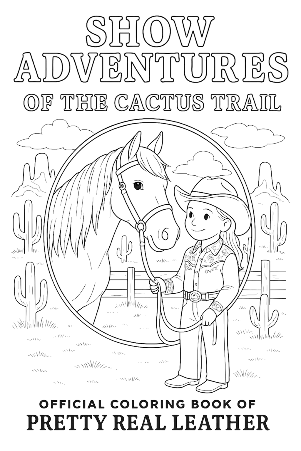 We introduce the first official Pretty Real Leather Coloring Book. Take an adventure with Sadie and her beloved horse, Hollywood, as they prepare and compete in a Ranch Horse Show located in the beautiful American West. The book has 26 pages of fun and vivid images. It also includes a ranch themed word search.