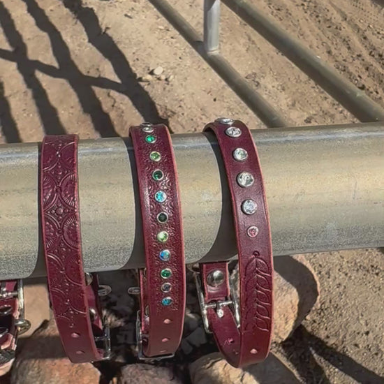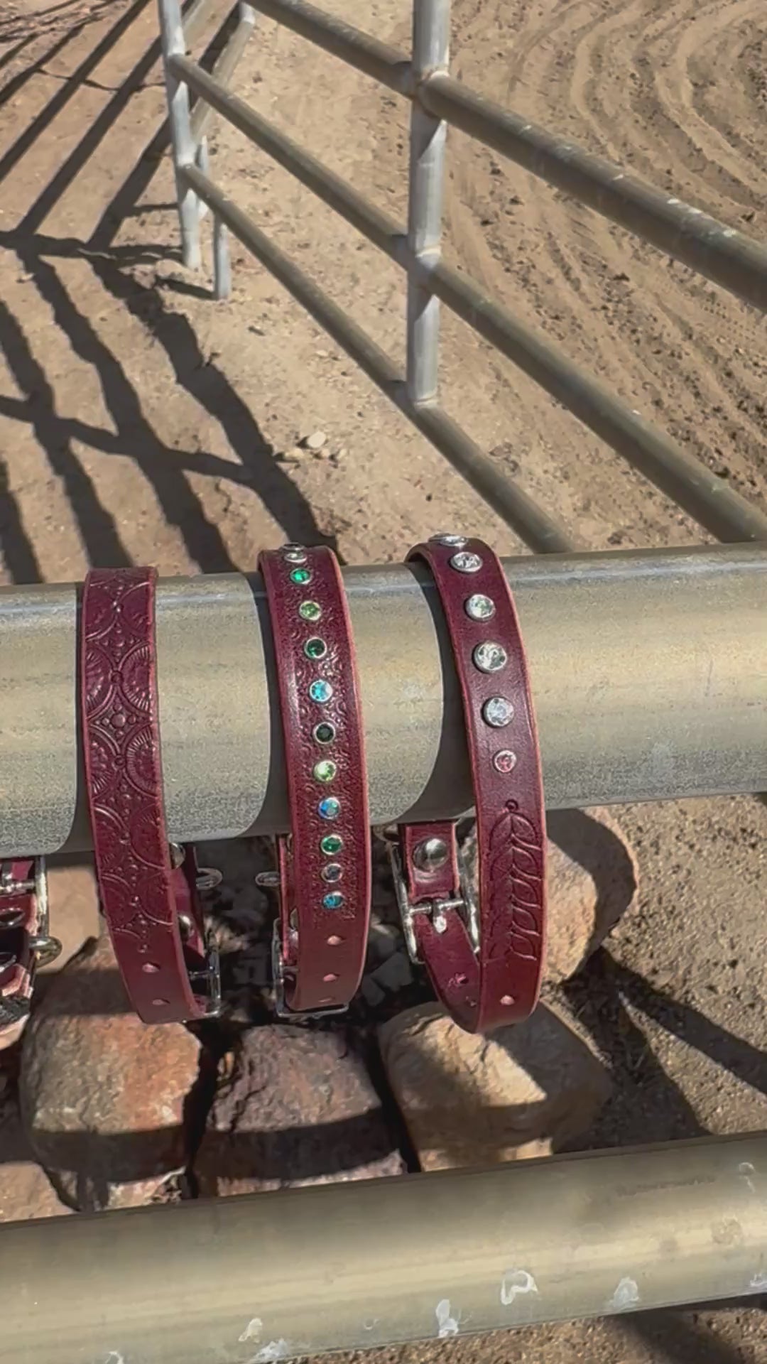 1/2” wide latigo strap tooled dog collar. Total length 14.5”. Neck hole diameters range from 9”-12.5”.