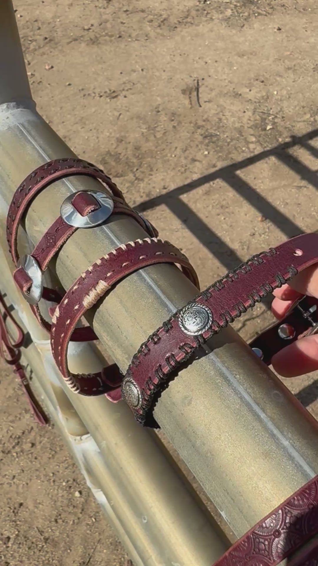 1/2” wide latigo strap tooled dog collar. Total length 14.5”. Neck hole diameters range from 9”-12.5”.