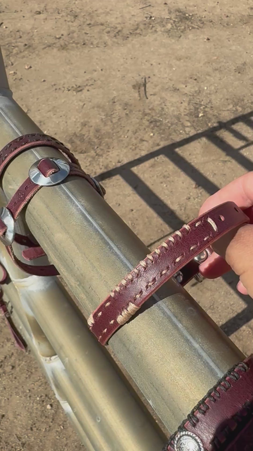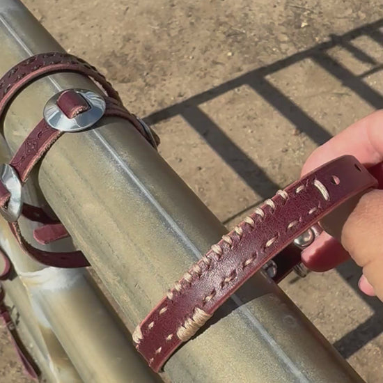 1/2” wide latigo strap tooled dog collar. Total length 14.5”. Neck hole diameters range from 9”-12.5”.