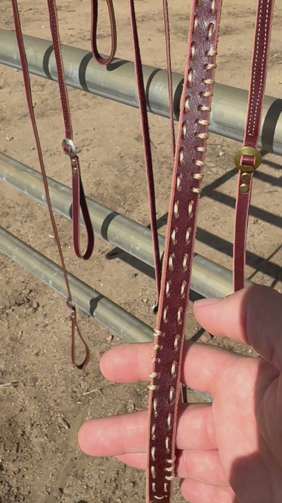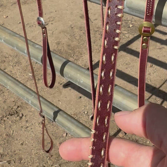 1/2” latigo strip leash with one double-slotted brass concho near handle. End to end variable edge and linear hand-stitched design in natural tan. Length: 44 inches