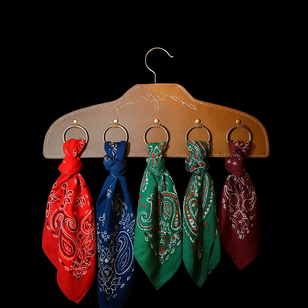 A genuine leather wild rag holder. It is custom designed to travel with ease in your garment bag. It also functions well in your closet. The front of the holder fits 5 of your beautiful scarfs. The open back allows for multiple layers of pants, shirts and jewelry to hook on. Keep your scarfs, clothes and jewelry organized in one simple and functional package. The sleeve design fits over most hangers. A second hanger will also be shipped with the unit as a replacement.